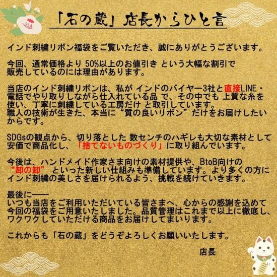 110pt 【石の蔵】PREMIUM インド刺繍リボン福袋《11,111円》豪華バラエティセット 数量限定 11,111円(税1,010円) 数量 − + shopping_cartカートに入れる mail_outline この商品についてお問い合わせ favorite 型番: 2026fuku-6 ツイート error_outline 特定商取引法に基づく表記 (返品など) share この商品を友達に教える undo 買い物を続ける forum レビューを見る(0件) rate_review レビューを投稿
